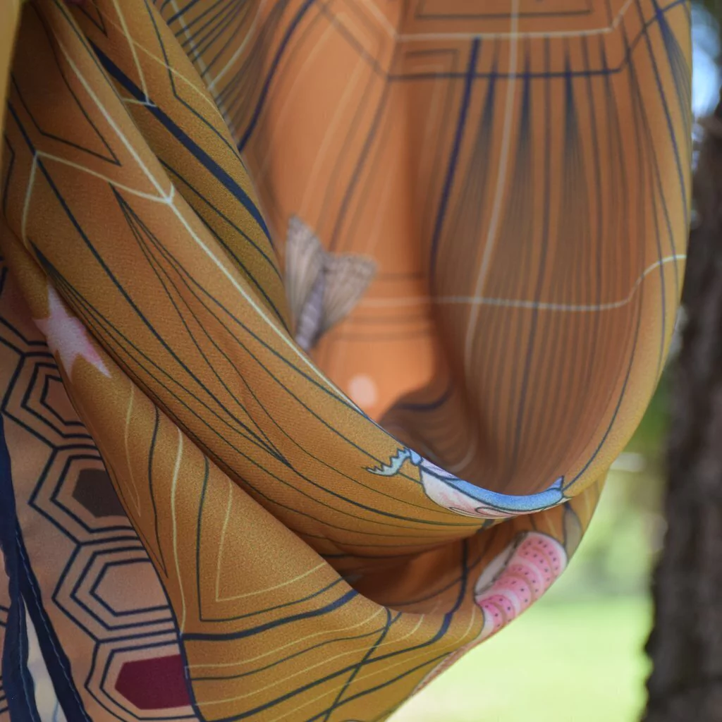 La estampa está llena de detalles que aparecen de cualquier manera que se pliegue el pañuelo. Impreso sobre seda lavada.